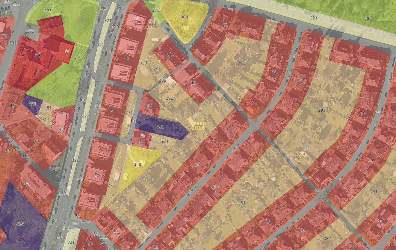 | 40 | Mischbauflächen | Bebaute Flächen, die dem Wohnen und Gewerbe, Handel und der Wirtschaft dienen. Geschäftszentren in Stadtkernen, Kaufhäuser, Verwaltungen, Bürohäuser, Einzelhandelsgeschäfte, Gaststätten, Hotels. Wohnen gemischt mit Gewerbe ( Büro, Ärzte, Rechtsanwälte,… ) An die Bebauung anschließende Freiflächen (Hausgärten/Ziergärten) werden in Abhängigkeit der Tiefe und Ausdehnung unter dem Kriterium 271 und 291 geführt. |  |